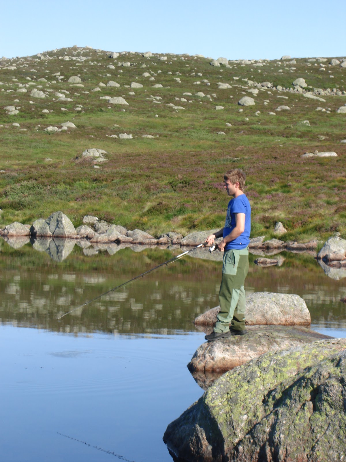 Vi fant til slutt et lite vann og en passende teltplass som vi slo oss ned på. Det gjaldt å få opp teltet og komme seg til vannet for å fiske for det hoppet og spratt utrolig i vannet. Resultatet av helgens fisking er ikke mye å skryte av for min del (1 FISK!!!) mens Tom Ove satte derimot personlig rekord tror jeg (20 FISK!!).